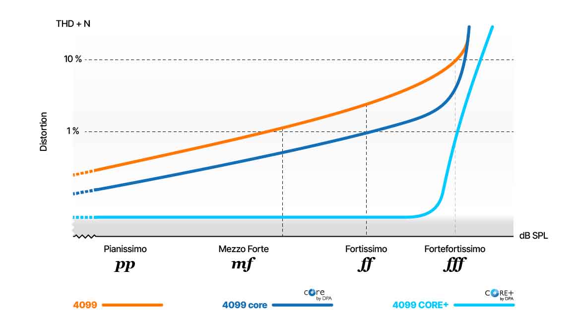 As can be seen from the illustration below, CORE+ pushes distortion down to an absolute minimum across the entire dynamic range. Yet beyond that, CORE+ also significantly extends the dynamic range. The 1% THD threshold has been pushed 10 dB higher, meaning the microphone maintains linearity across a much wider input range. Additionally, the clipping point of the 4099 has been increased by 3 dB, allowing it to handle even more extreme sound pressure levels without compromising sound quality.